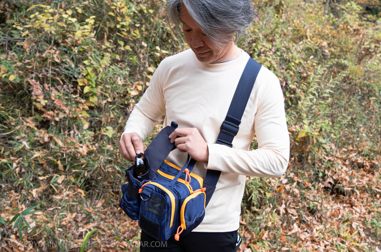 機関銃のマガジンストレージのデザインをもった、マグネット式の大型フラップつきの縦長ポケット。サングラスなどがすっぽり入る。