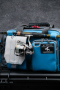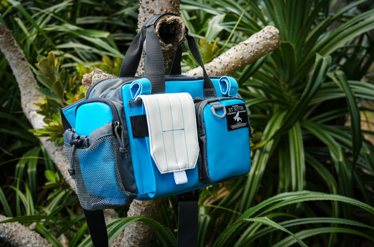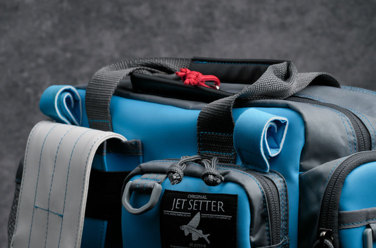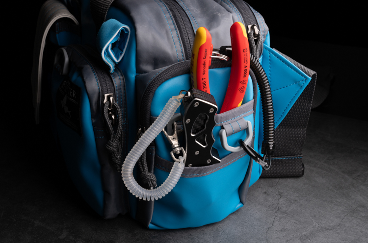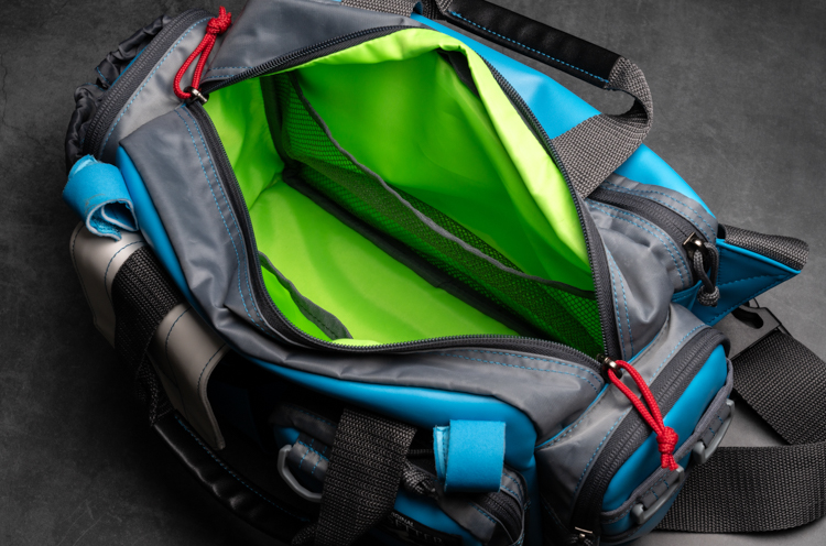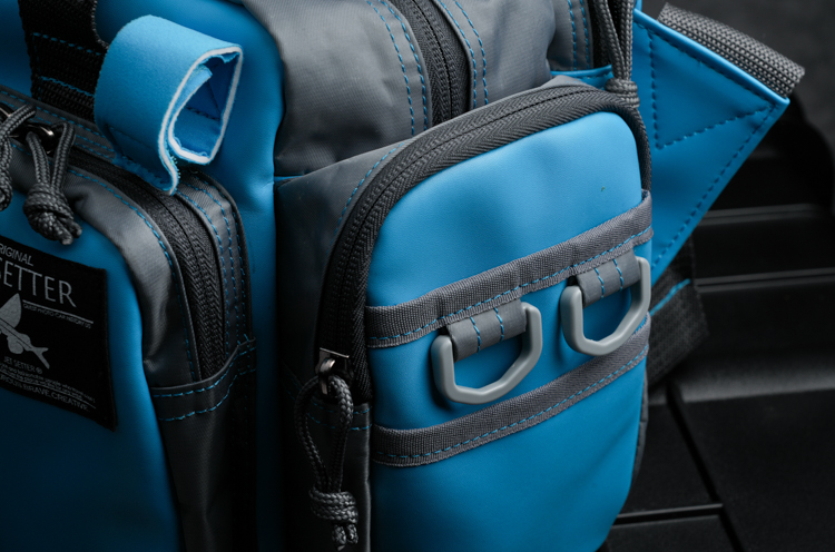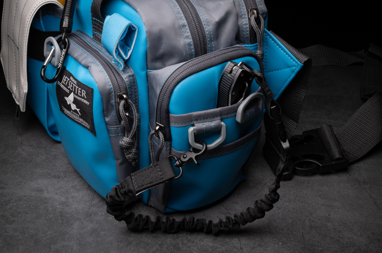 新ギミックとしてバッグ前面の上部にロッドを固定するベルトを配置。ウェーディング中など、ロッドを置けない場所でのルアーやリーダーの交換時、また撮影等を行うときに両手をフリーにすることができます。