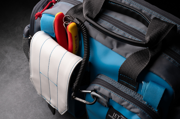 右サイドポケットに段違いのサイドポケットを追加。これによりプライヤーとフィッシュグリップなど、すぐに取り出したいものを同時に配置することが可能となりました。Dリングも二つにし、それぞれリーシュコードを装着し取り付けることができるように。その他にもアイデア次第で様々便利に使用できる拡張性も広がっております。