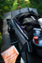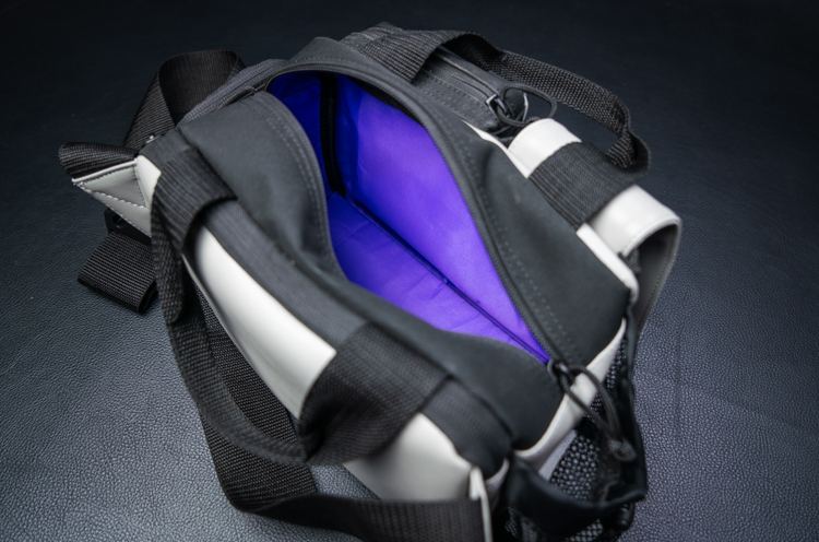 持ち運びはストラップの伸縮によって、肩掛けのショルダーストラップにも、短くしてウエストバッグにもすることができます。上部のハンドルでの手持ち移動もしやすいサイズ。