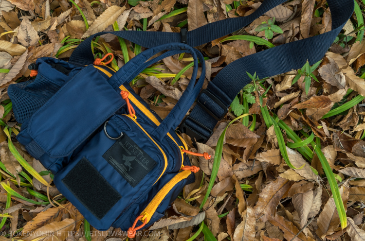 機関銃のマガジンストレージのデザインをもった、マグネット式の大型フラップつきの縦長ポケット。サングラスなどがすっぽり入る。