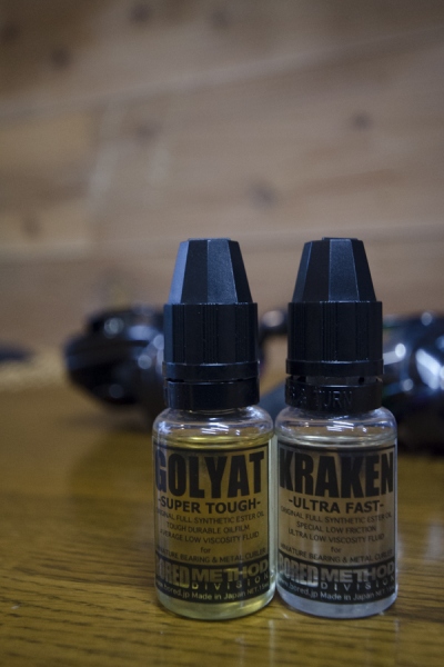 [KRAKEN] 〜クラーケンはミニチュアベアリングやメタルカーラー等への使用を前提として設計した超低粘度なチューニングオイル。より回転を良くするためのオイルで、皮膜保持能力が高いため持続力があります。 [GOLYAT]〜ゴリアテは、より持続力があり、面圧に強い金属表面の改質までも行う超低粘度オイル。クラーケンとの併用をすることで、回転の良さとオイル切れを防ぐ効果も。