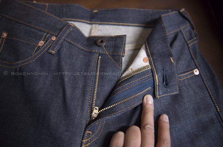 フロントはジッパーとしました。信頼のYKK製で10年履いてもらうためのパーツ。