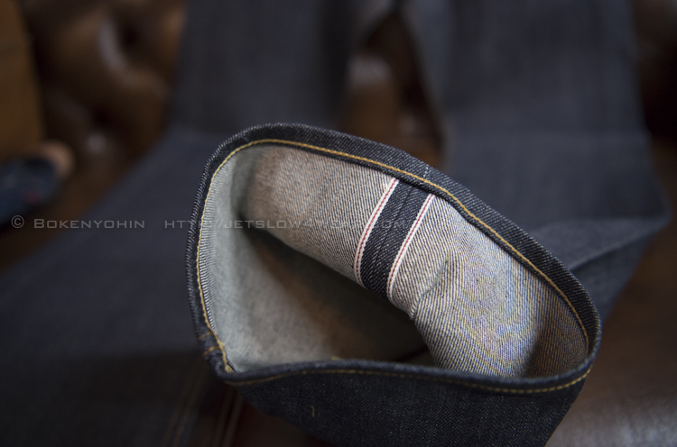 「赤耳」のリジッドデニム。13.5オンスのセルビッチデニムです。いわゆる生地の両端に耳と呼ばれる部分ができる、昔の旧式織機を使って織っています。