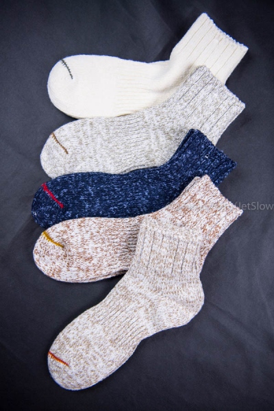靴下の名産地、奈良県で生産した、吸湿・拡散性を持つ丈夫な靴下です。昔ながらのビンテージ編機を使った、ひとつひとつが手作りとなっています。1日の生産量は一人当たり20足。HEMPの糸を使った、味があり独特のカラフルさが売りの少量生産品です。