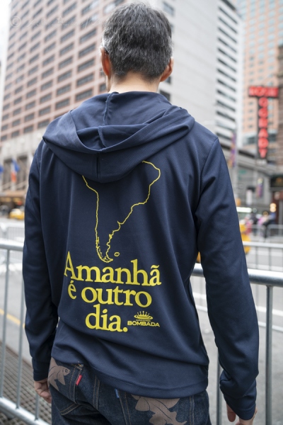 今回のモデルは前面の襟元にワンポイント、そしてバックプリントに南米大陸のみとできるだけシンプルなデザイン。ダークネイビーに蛍光色系のメローイエローのプリントで、コントラストは鮮やかに。プリントは控えめとした大人の旅ウエア、アウトドアウエアになりました。